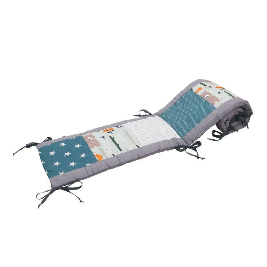 Protectia ideala pentru fiecare pat de bebelus, inaltime de 30 de centimetri si captusita gros. Îți protejează copilul de curentele de aer în timpul somnului și de punctele de presiune neplăcute. Bara de protecție pentru pat are o îndoire integrată la fiecare 70 de centimetri și se adaptează deosebit de bine la colțurile patului pentru copii. Mai multe curele oferă cadrului de pat o stabilitate suplimentară și previn cutele enervante. Un spate simplu este combinat cu o față de petice de 20 x 23 centimetri cu modele diferite. Capătul este un chenar lat de aproximativ cinci centimetri în culoarea spatelui. Pentru cuib a fost folosit doar bumbac 100%, certificat conform standardului ÖkoTex. Acest material de înaltă calitate este deosebit de moale, testat pentru substanțe nocive și antialergic și îndeplinește specificațiile stricte pentru bebeluși și copii. Tapițeria cadrului patului este realizată din poliester certificat ÖkoTex. Detalii produs: